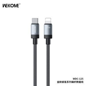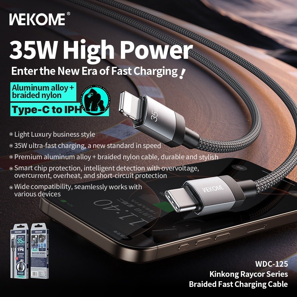 Wekome WDC-125 Kinkong Raycor Series – 35W braided USB-C to iPhone fast-charging cable with durable braiding, aluminum alloy connectors, and 480Mbps data transfer.