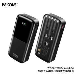 The WP-66 is a high-capacity 20000mAh power bank with built-in Lightning, Micro, and Type-C cables, designed for travelers, power users, and anyone who needs reliable, high-speed charging for multiple devices.